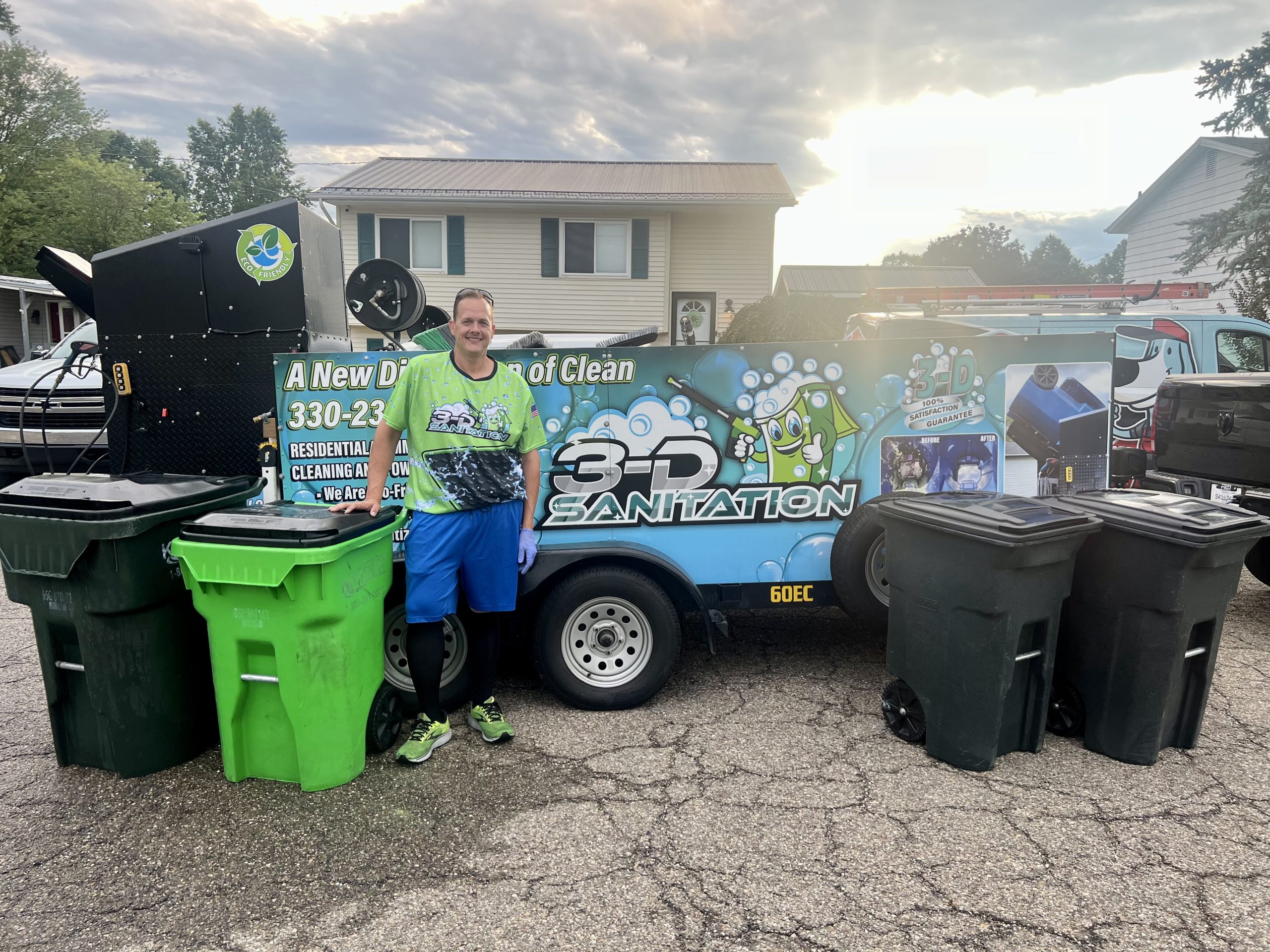 Most people use bleach or other harsh chemicals and then dump them into their yard or storm drains. Our equipment uses 200° water at over 4500psi to clean AND sanitize your cans in just a few minutes.